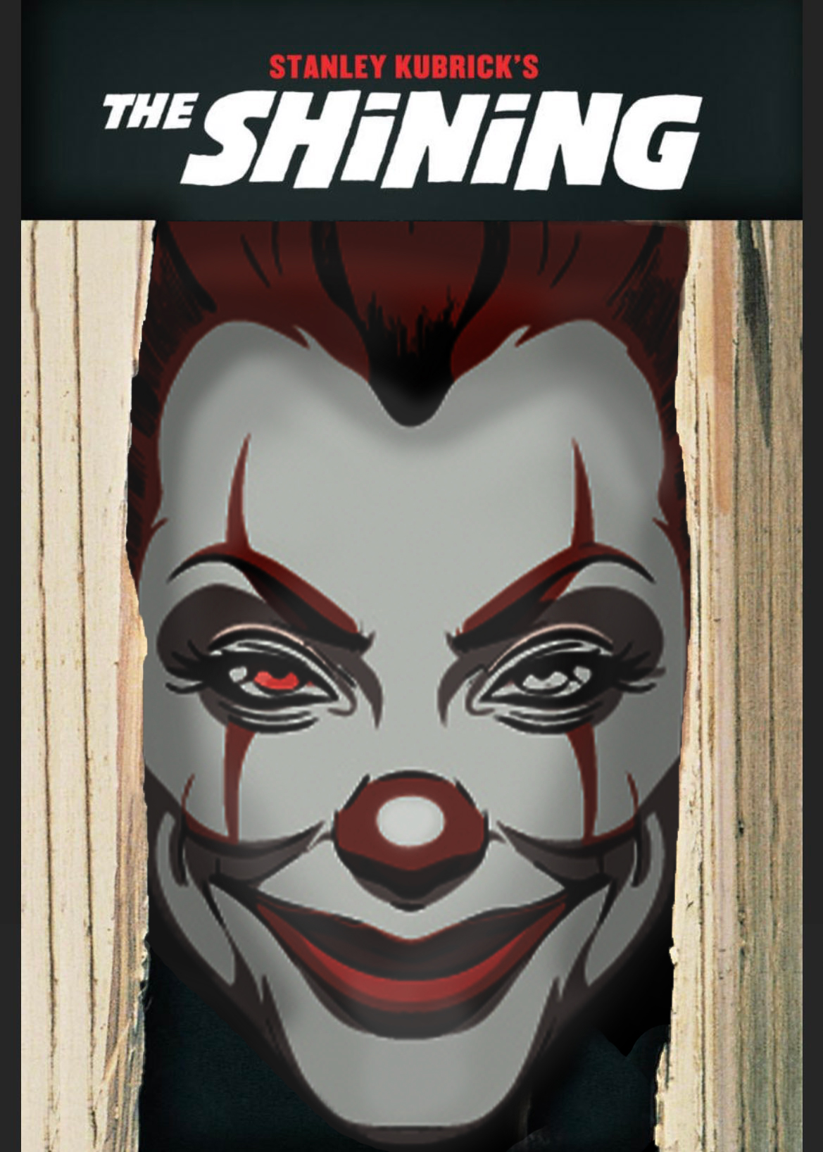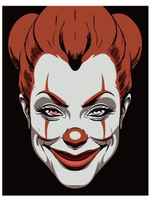 生成AIキーワード:顎が長い 目が顔の半分 口がでかくて裂けている すごく怖い笑顔 黒目が右を向いている 髪が赤い 女のピエロ