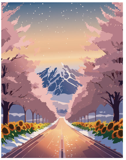 生成AIキーワード:綺麗な桜がたくさん咲いている、真ん中に道、雪が積もっている、道の横には大きな向日葵がたくさん咲いている、空はピンクの夕日