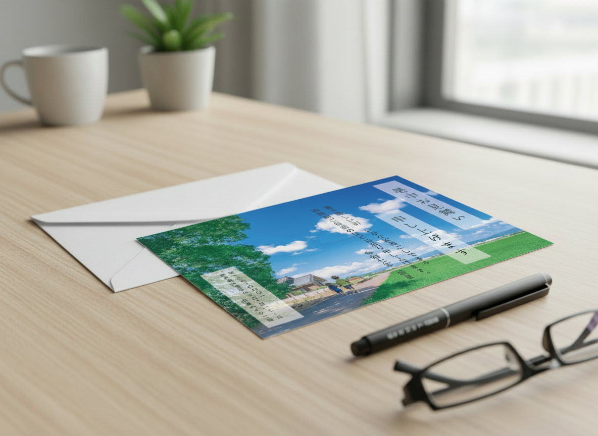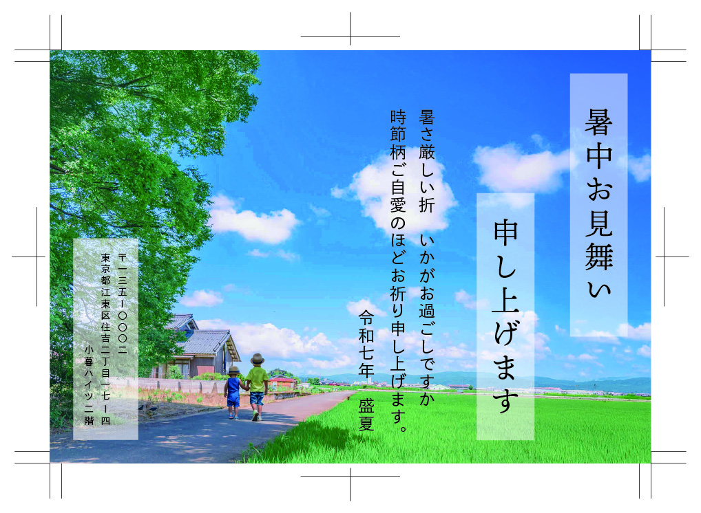 縦書きの文字配置と余白を活かし、静けさと品のある暑中見舞いとして成立するよう全体のバランスを整えました。